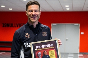 今天,阿隆索在勒沃库森举行的最后一次新闻发布会后,收到了记者们赠送的礼物。