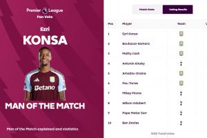 此役孔萨为维拉踢满全场,并取得进球,英超官方宣布,他当选本场比赛最佳球员。