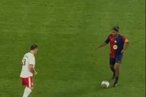 比赛中,小罗踩单车加牛尾巴过掉了对方球员,随后对手膜拜小罗。
