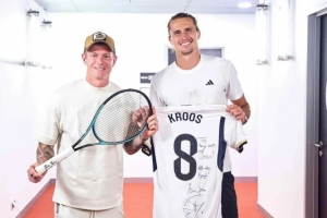 体育资讯4月28日讯 据《马卡报》报道称,克罗斯现场观看了兹维列夫在马德里大师赛的比赛,并向他赠送了皇马球衣。