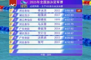 在2025全国游泳冠军赛女子400米自由泳决赛中,李冰洁突破4分大关游出3分59秒99,创造新的亚洲纪录获得冠军,杨佩琪获得亚军,柳雅欣获得铜牌。