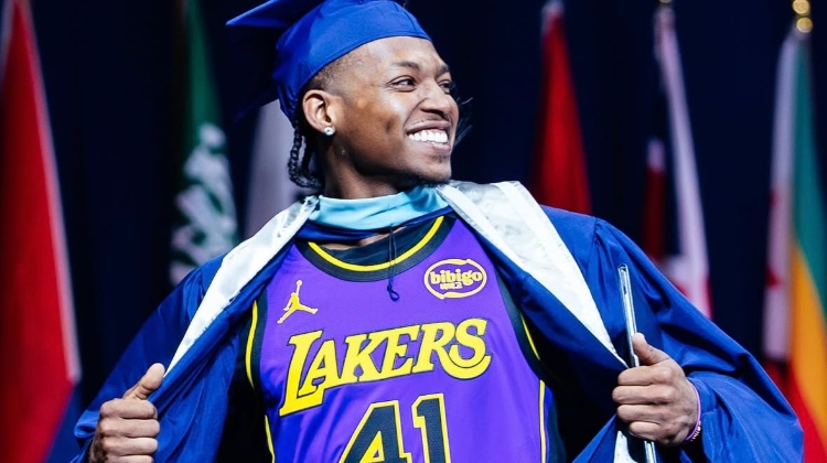 在硕士服里面,他将南湾湖人的球衣穿在了身上。