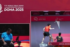比赛第二局,裁判认为王楚钦发球抛球角度违规,王楚钦发起鹰眼挑战,最终经过判定王楚钦发球合规,发球角度为24.67°(规定不超过30°)。