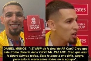 穆尼奥斯当选本场比赛最佳球员,赛后他接受TNT采访时说道:“足总杯决赛最佳?我想这个奖杯上应该写着水晶宫。我认为今天真正的主角是我们所有人。因为如果有一个环节出了问题,我们今天就无法有如此出色的表现。当选最佳球员让人感到开心、快乐,但我们球队中的每个人都配得上这个荣誉。”