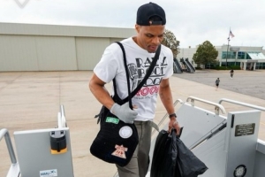 体育资讯5月18日讯 今日美媒Noweez晒出威少登机前往客场的照片,他带着手套。
