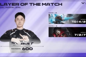 体育资讯5月18日讯 在刚刚结束的比赛中,Zeus两局合砍17/6/9的战绩,拿下HLE对阵DNF系列赛MVP。