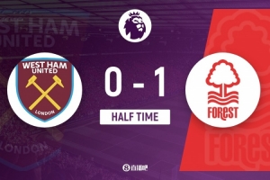伤停补时4分钟。上半场比赛结束,西汉姆联0-1诺丁汉森林。