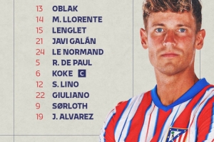 马竞首发:13-奥布拉克、14-略伦特、15-朗格莱、21-加兰、24-勒诺尔芒、5-德保罗、6-科克、12-利诺、22-朱利亚诺-西蒙尼、9-索尔洛特、19-阿尔瓦雷斯