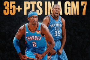 据统计,亚历山大是雷霆队史(2008年至今)第二位在抢七大战中砍下35+的球员,比肩杜兰特。
