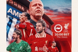 利物浦官方社媒发布了为此役制作的海报,主帅斯洛特携范迪克、萨拉赫、索博斯洛伊、阿利森出镜。