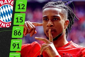 奥利塞本赛季为拜仁出战34场德甲比赛,打进12球,助攻15次,当选WhoScored德甲最佳球员。