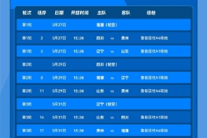 B组,5月27日15:30辽宁vs山东、5月31日15:30山东vs四川、6月5日15:30四川vs辽宁。