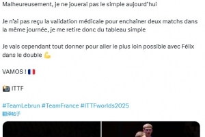 大勒布伦在世乒赛开始之前右手受伤,法国乒协表示大勒布伦退出单打比赛这一决定是为了球员更好地专注双打比赛。