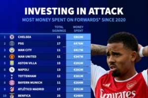 《转会市场网》统计,自2020年以来,阿森纳在边锋和前锋上只花费了8000万欧元,只签下了6名球员。在锋线的支出榜单上,枪手仅排在第60位。而且还不包括7500万欧元的哈弗茨,他被算作了攻击型中场,即使加上哈弗茨,阿森纳也只能排在第26位。