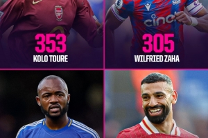 据Opta数据统计,在英超效力的非洲球员中,出场次数达到300场的仅有4人,以下是具体排名: