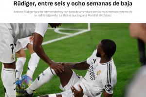 《阿斯报》确认了吕迪格缺阵的时间为6-8周,并且透露,皇马方面的计划是让他能够赶上六月下旬开始的世俱杯。皇马届时将在小组赛先后对阵利雅得新月、帕丘卡以及萨尔茨堡红牛。
