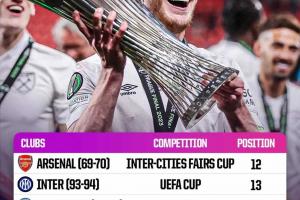 西汉姆联(2022-23赛季,欧会杯冠军):联赛排名第14位