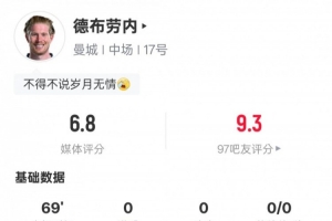 体育资讯5月21日讯 英超第37轮,曼城对阵伯恩茅斯,德布劳内主场告别战首发登场,送出2次关键传球,但也错失1次进球机会,评分6.8。