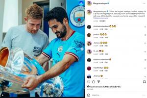 此役是德布劳内在曼城的主场告别战,京多安社媒晒出与德布劳内的合照,并写道:“我在曼城踢球最大的荣幸之一,就是能与你分享球场、更衣室以及那些难忘的回忆。祝你和你的家人一切顺利,我们会想念你的。”
