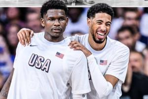 去年巴黎奥运会美国男篮12人名单:詹姆斯、库里、杜兰特、浓眉、恩比德、塔图姆、布克、朱-霍勒迪、安东尼-爱德华兹、哈利伯顿、阿德巴约、德里克-怀特;