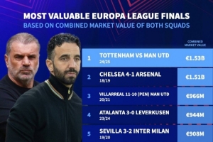 体育资讯5月21日讯 据统计,热刺vs曼联的欧联决赛是身价最高的欧联决赛对阵,两队总身价15.3亿欧。