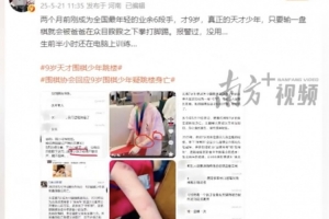 近日,多个自媒体账号报料称,“年仅9岁的已达到业余6段的围棋手小朱(化名),在受到父亲家暴后坠楼。”同时在多个微信群内,有网友发布消息称,“5月19日晚八点四十六分,经确认:九岁围棋业余6段小朋友跳楼后死亡。生前长期因输棋被父亲极端殴打,选择了轻生。”
