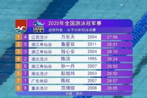 万乐天决赛中游出了27秒56的成绩夺金,鲁星辰28秒01收获亚军,钱心安28秒10夺得季军,本次比赛的前三名全部达到世锦赛A标。