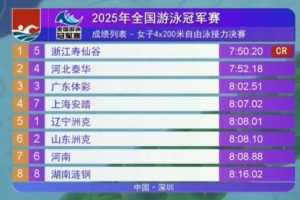 浙江队由吴卿风、余依婷、严窕珊、柳雅欣组成,决赛中游出了7分50秒20的成绩夺冠,河北和广东分别获得亚军和季军。