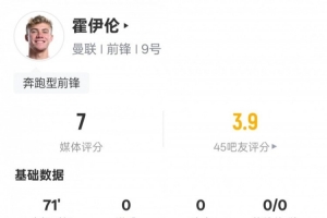 体育资讯5月22日讯 欧联杯决赛,曼联对阵热刺,霍伊伦首发出战,2次射门1次射正,送出1次关键传球,评分7.0。