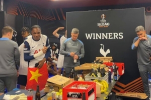 英超排名第17位的热刺获得欧冠资格,赛后球员们在更衣室内列队听欧冠主题曲。