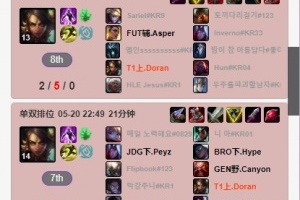 体育资讯5月22日讯 根据韩服排位统计小程序显示,T1上单Doran近日在韩服排位中连续玩了数把上单豹女,但是战绩欠佳!