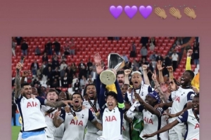 赛后热刺旧将阿里在社交媒体上分享了热刺球员高举奖杯的照片,并配上了爱心和掌声的表情。