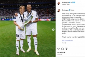 姆巴佩:能够在这个赛季与你并肩作战,我感到非常荣幸。通过近距离接触,我真正理解了“伟大”的含义……在成为史上最伟大的球员之一之前,你首先是一个极好的人。你在世界上最优秀的俱乐部书写了超过十年的历史,并赢得了所有荣誉。但你赢得的最宝贵的东西是无价的:全世界的尊重和敬仰,感谢你所做的一切,传奇。