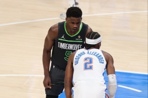 体育资讯5月23日讯 西决G2,上半场森林狼50-58雷霆。