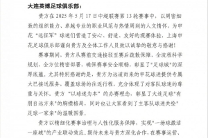 由衷感谢大连英博足球俱乐部在中超联赛第13轮比赛中,为申花远征军球迷提供的热情周到服务以及营造的优质赛事体验。欢迎广大大连球迷在十月来上海观赛,期待在未来的中超赛场,我们共同为球迷奉献更多精彩比赛!