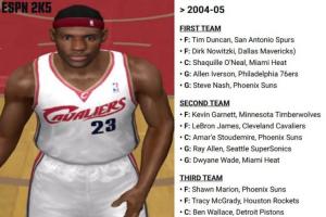 美媒晒出了20年前,詹姆斯第一次入选最佳阵容时(2004-05赛季)联盟最佳阵的情况: