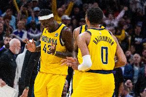 本场比赛,西亚卡姆出战32分钟,23投15中,三分5中3,罚球8中6,狂轰生涯新高的39分(此前最高分37分),外加4板3助1断;哈利伯顿在35分钟的时间里,投篮16中5,三分球10中3,罚球2中1,拿到14分8篮板11助攻2抢断的数据。