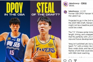 Lakeshow写道:“前CBA最佳防守球员杨瀚森有望加盟湖人? 👀 预计在2025年NBA选秀第二轮被选中的杨瀚森可能不会成为头条新闻,但他可能会成为一个意外之喜。这位身高7英尺2英寸(2.18米)的中国中锋拥有顶级的臂展、时机把握能力和尚未开发的巨大潜力,完美契合了湖人在球员身高和未来发展方面的需求。”