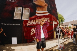 体育资讯5月24日讯 红军队长范迪克已经成为利物浦这座城市的传奇人物,利物浦球迷在街头建筑物为范迪克描绘巨幅涂鸦,范迪克亲自前往打卡,并与球迷一起签名合影。