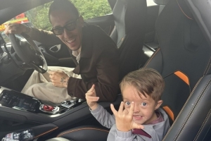 利物浦小球迷艾萨克-卡尼患有贺许宏氏综合征,齐米卡斯将他邀请到兰博基尼车内,亲切地与他合影。