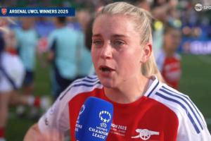 体育资讯05月25日讯 阿森纳女足1比0力克巴萨女足夺冠,赛后阿森纳女足前锋鲁索眼含热泪接受了采访。