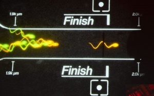 整场比赛以“同步起跑”的方式开始,精子靠自然的化学信号和流体动力前进。过程使用高分辨率成像和微观追踪技术,将被显微摄像头捕捉到的画面投到大屏幕,实时追踪两个0.05毫米的小蝌蚪在赛道上的每一次摆尾冲刺。