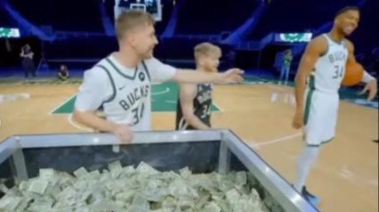 比赛内容是在四个不同位置(篮下、罚球线、三分线、中圈)命中投篮,结果字母哥经典卡在罚球上,对手命中logo三分拿走10万美金。