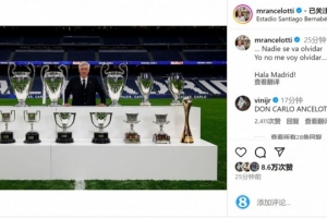 安切洛蒂今夏离开皇马帅位,他在社交媒体上晒出与奖杯的合照,配文:“没有人会忘记,我也不会忘记。Hala Madrid!”