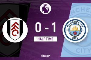 上半场伤停补时1分钟,半场结束,曼城暂1-0富勒姆。