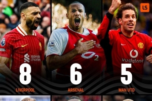 据LiveScore统计,利物浦球员8次获得英超金靴,所有俱乐部之中最多,阿森纳6次第二多。