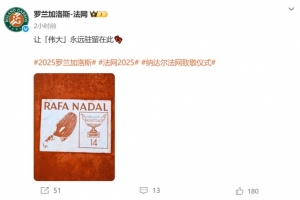 法网官方为纳达尔举行了致敬仪式,38岁的纳达尔回到自己曾征战的红土场地。法网官方还准备了一个小惊喜,那就是在中央球场的场边为纳达尔制作了特制脚印以及印有14冠的徽章。