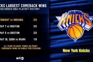 据统计,尼克斯本场曾35-55最多落后20分,最终完成逆转,追平了队史季后赛最大逆转分差,这也是他们第三次在季后赛完成20分逆转。