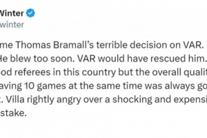 记者Henry Winte在社交媒体上写道:“你不能把托马斯-布拉莫尔(主裁)的糟糕判罚归咎于VAR,这完全是裁判自身的问题。他吹哨太早了,VAR本可以救他。”