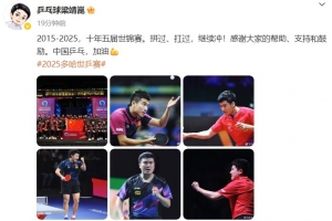 梁靖崑写道:“2015-2025,十年五届世锦赛。拼过、扛过,继续冲!感谢大家的帮助、支持和鼓励。中国乒乓,加油💪”